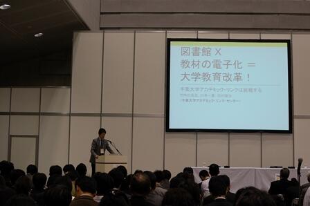 2011年11月19日(図書館総合展1日目)に、「図書館×教材の電子化=大学教育改革!:千葉大学アカデミック・リンクは挑戦する」と題した特別フォーラムが行われました。当日は座席が足りなくなるほどの来場者(約250名)があり、大盛況のうちに講演は終了しました。